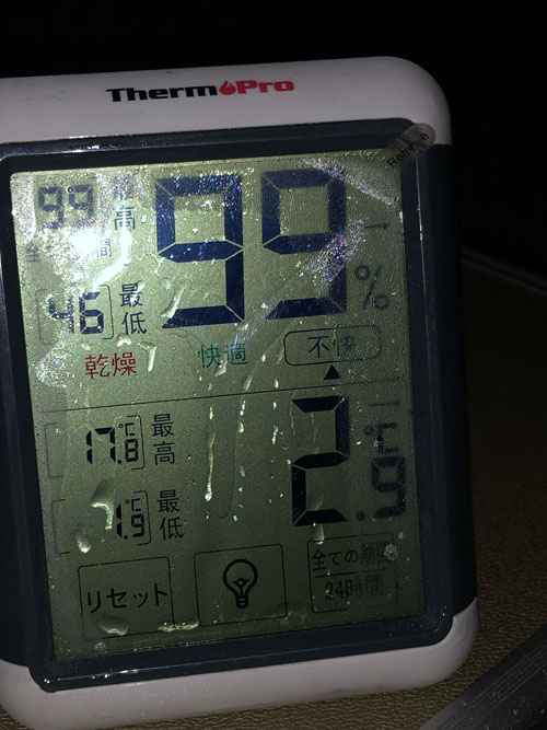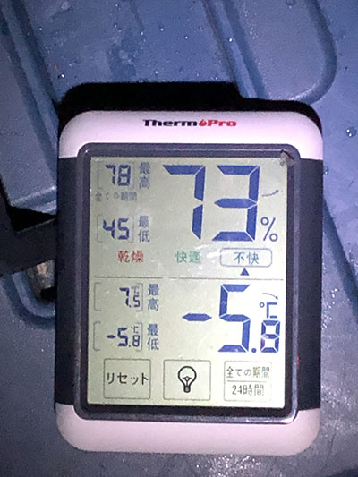 ちなみにこの日の最低気温はこんな感じ、防寒フル装備なら全然辛くない程度で快適でした。
